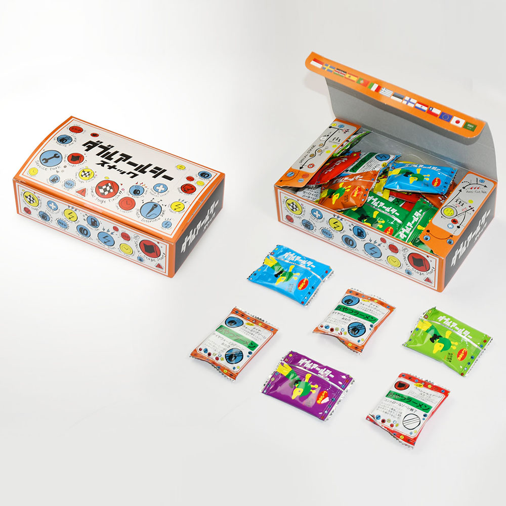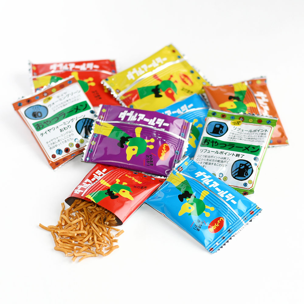 WRC(世界ラリー選手権)のコースアイコンをモチーフにしたパッケージデザインの、「おやつラーメン」です。